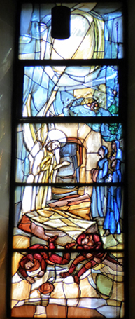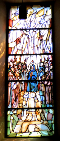 Freudenreicher Rosenkranz: Die fünf Buntglasfenster auf der linken Seite der Kirche zeigen das erste Geheimnis.